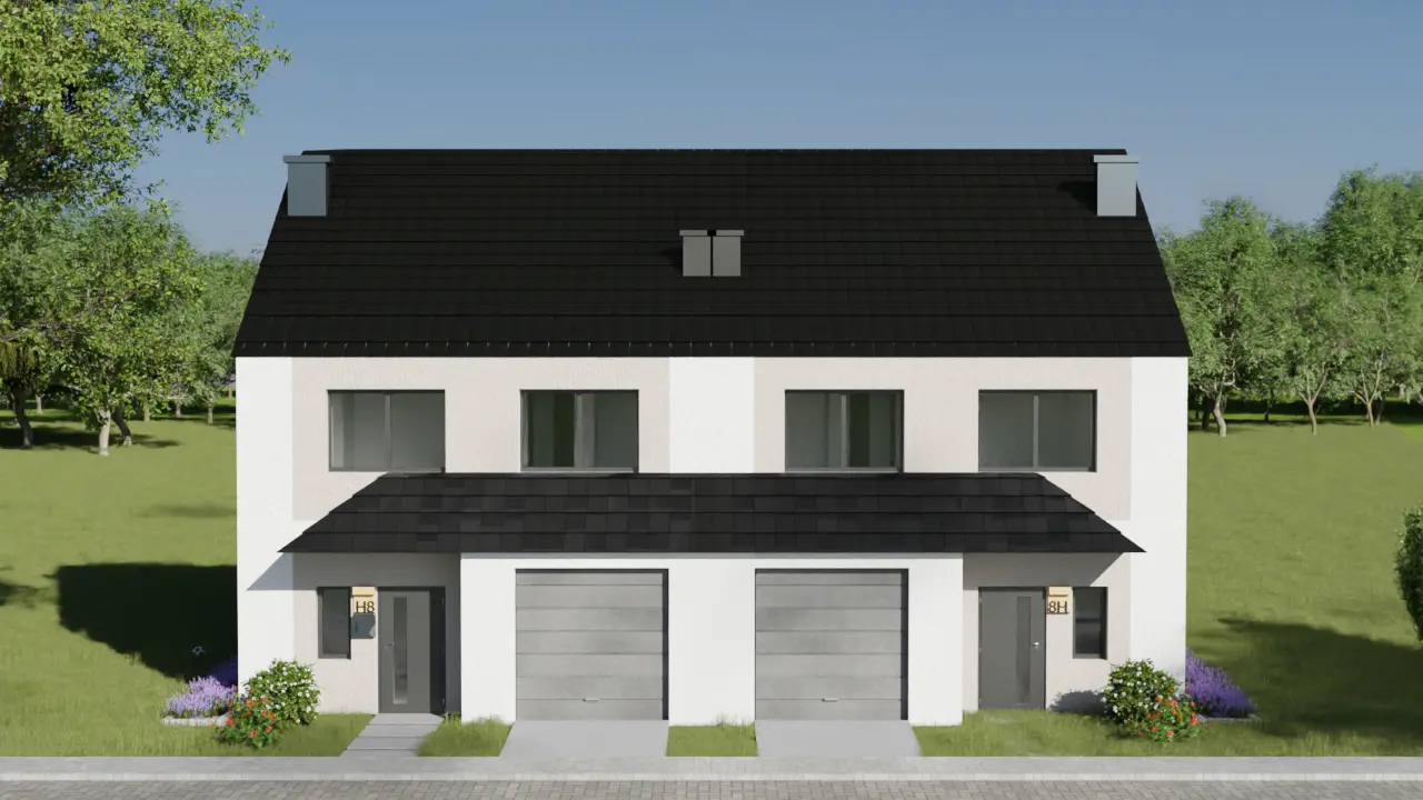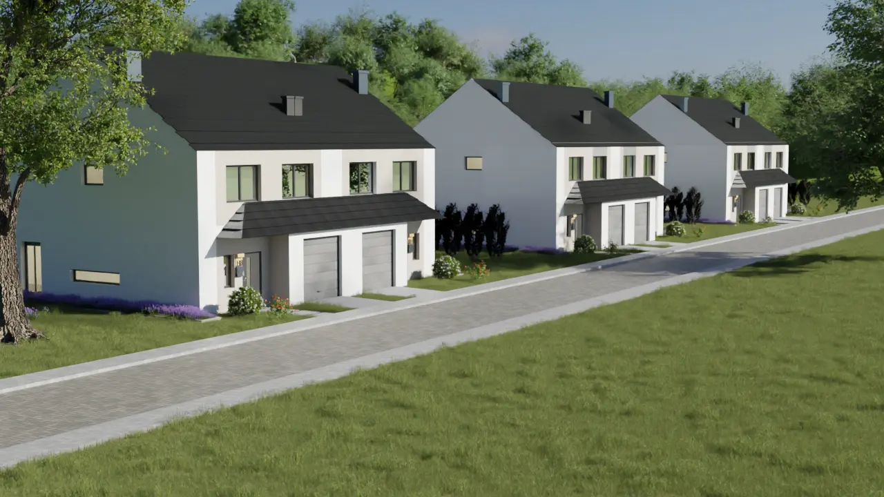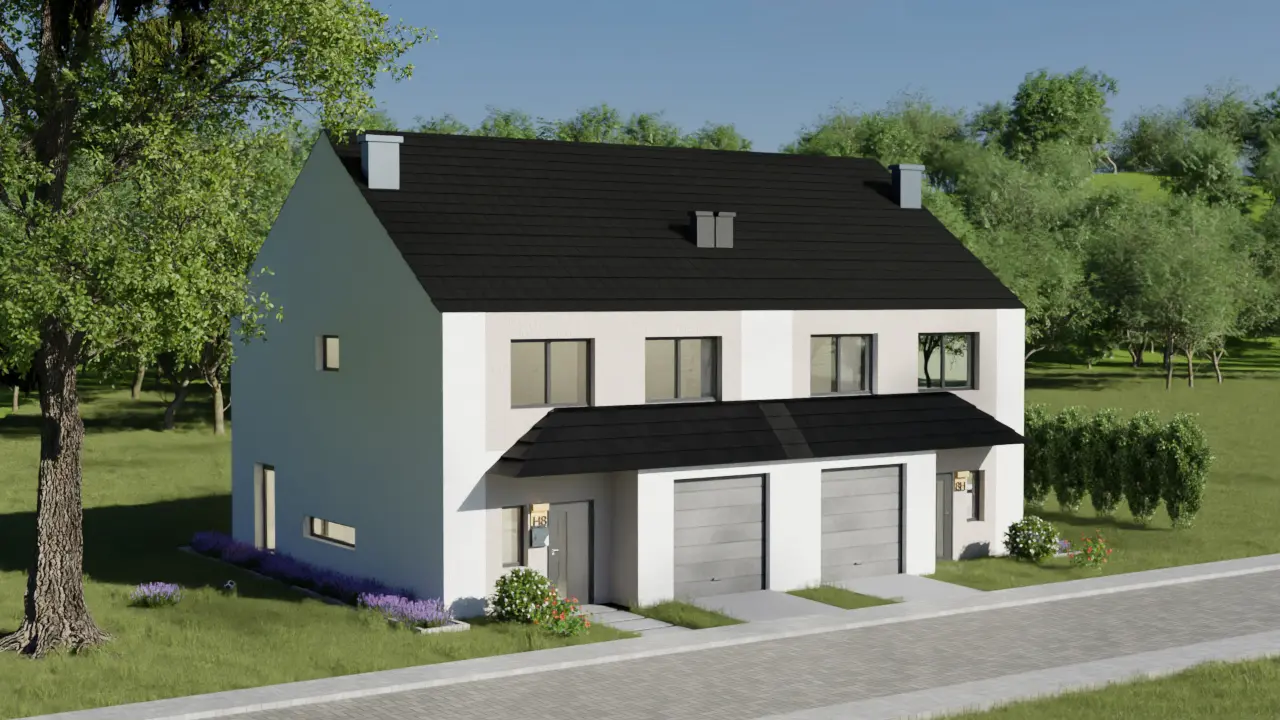 Pomiędzy bliźniakami zaprojektowano dwie niezależne ściany nośne z silki z dylatacją. To rozwiązanie znacząco poprawia wygłuszenie i komfort mieszkańców.