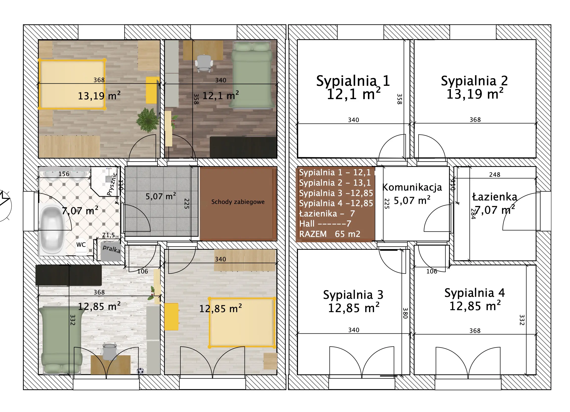 Piętro to strefa prywatna z czterema wygodnymi sypialniami. Pełna wysokość piętra (bez skosów) zapewnia komfort użytkowania wszystkich pomieszczeń.