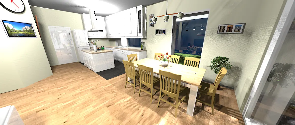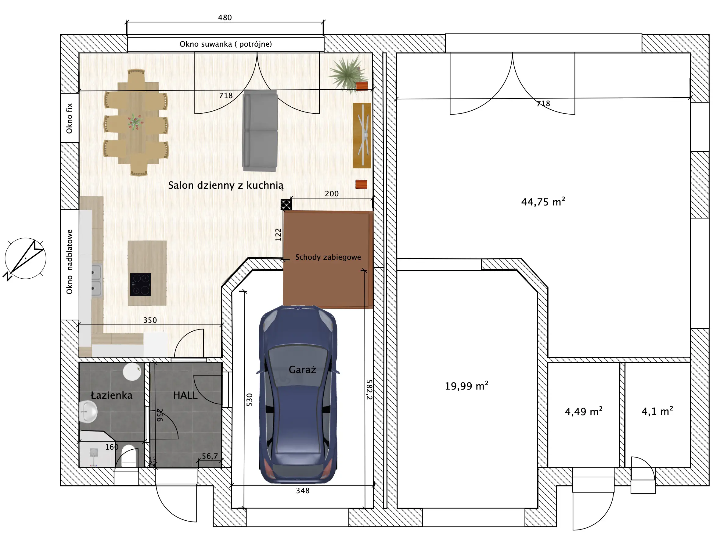 Na parterze znajduje się przestronna strefa dzienna z imponującymi przesuwanymi drzwiami tarasowymi o wymiarach 4,8 × 2,4 m, które wpuszczają mnóstwo naturalnego światła i optycznie powiększają przestrzeń.
